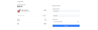 When checking out, shoppers will pick their shipping location, review the total, and place payment