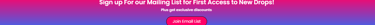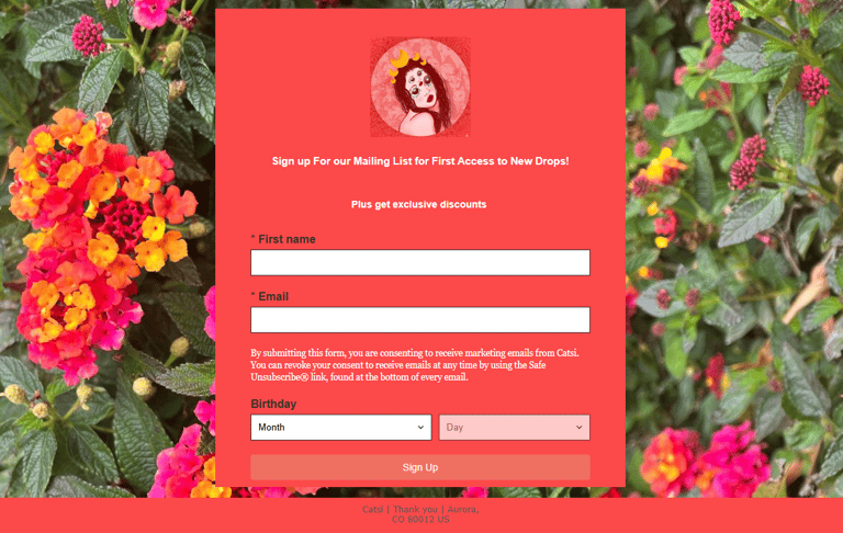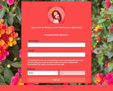 The footer of each page displays a button that brings the website user to an email marketing sign-up form.