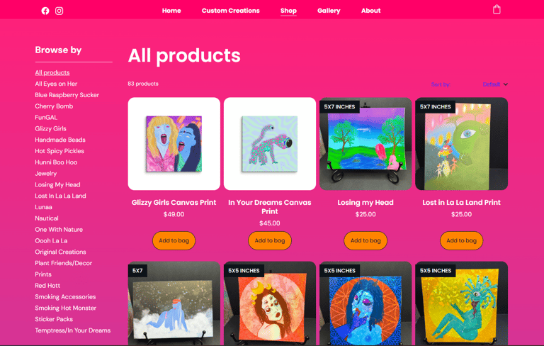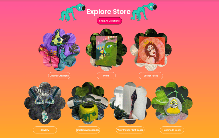 Button to view all products or an option to jump to a specific type of creation for ease of purchase, and to showcase the artist's abilities